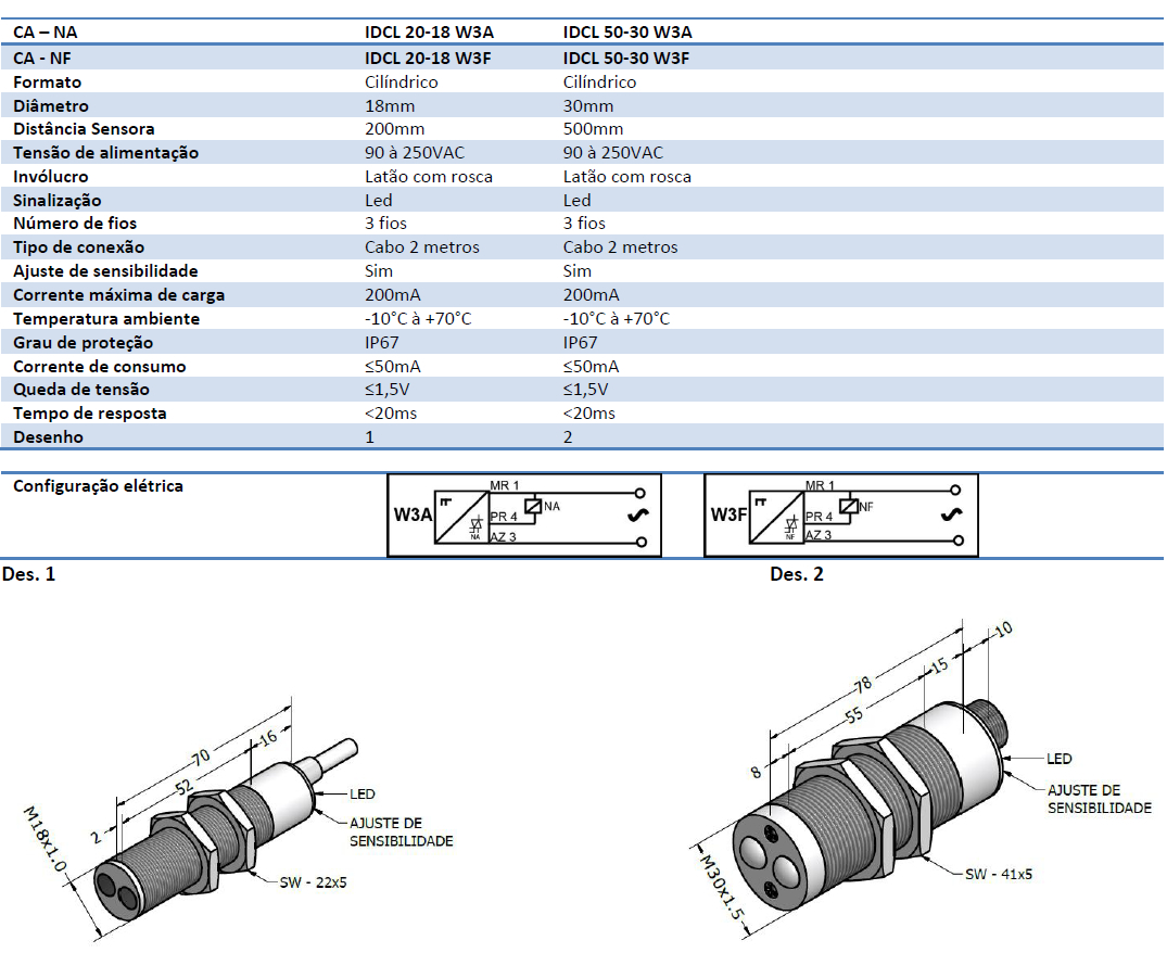 Fotoelétrico Difuso Corrente Alternada – 3 fios M18x1 – M30x1,5