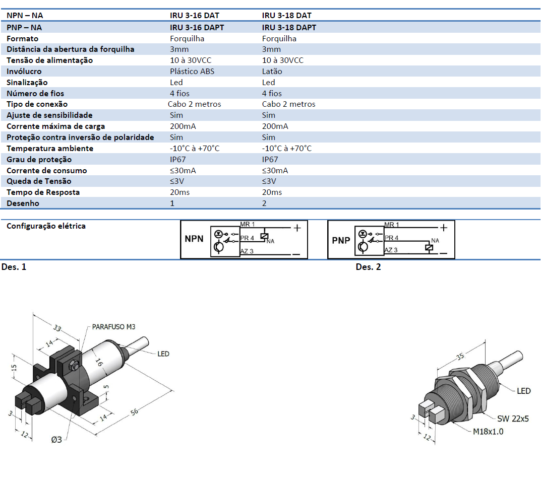 Fotoelétrico Forquilha Corrente Contínua: NPN – PNP – 3 fios